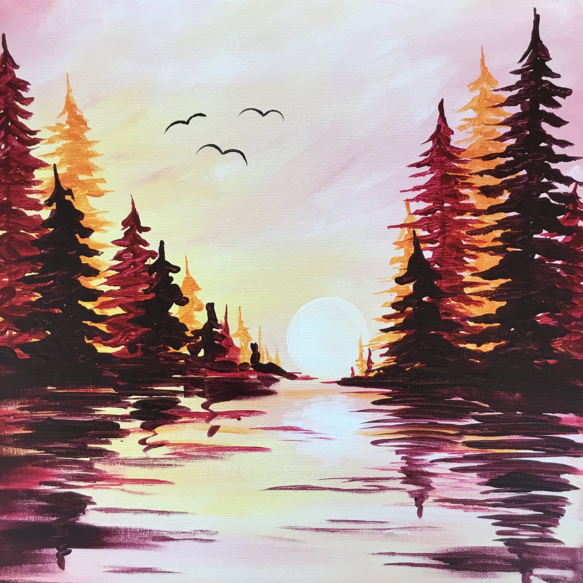 Enjoy working on a pastel background and a skyline of trees while you paint our fantastic forest scene, Evening Glow!