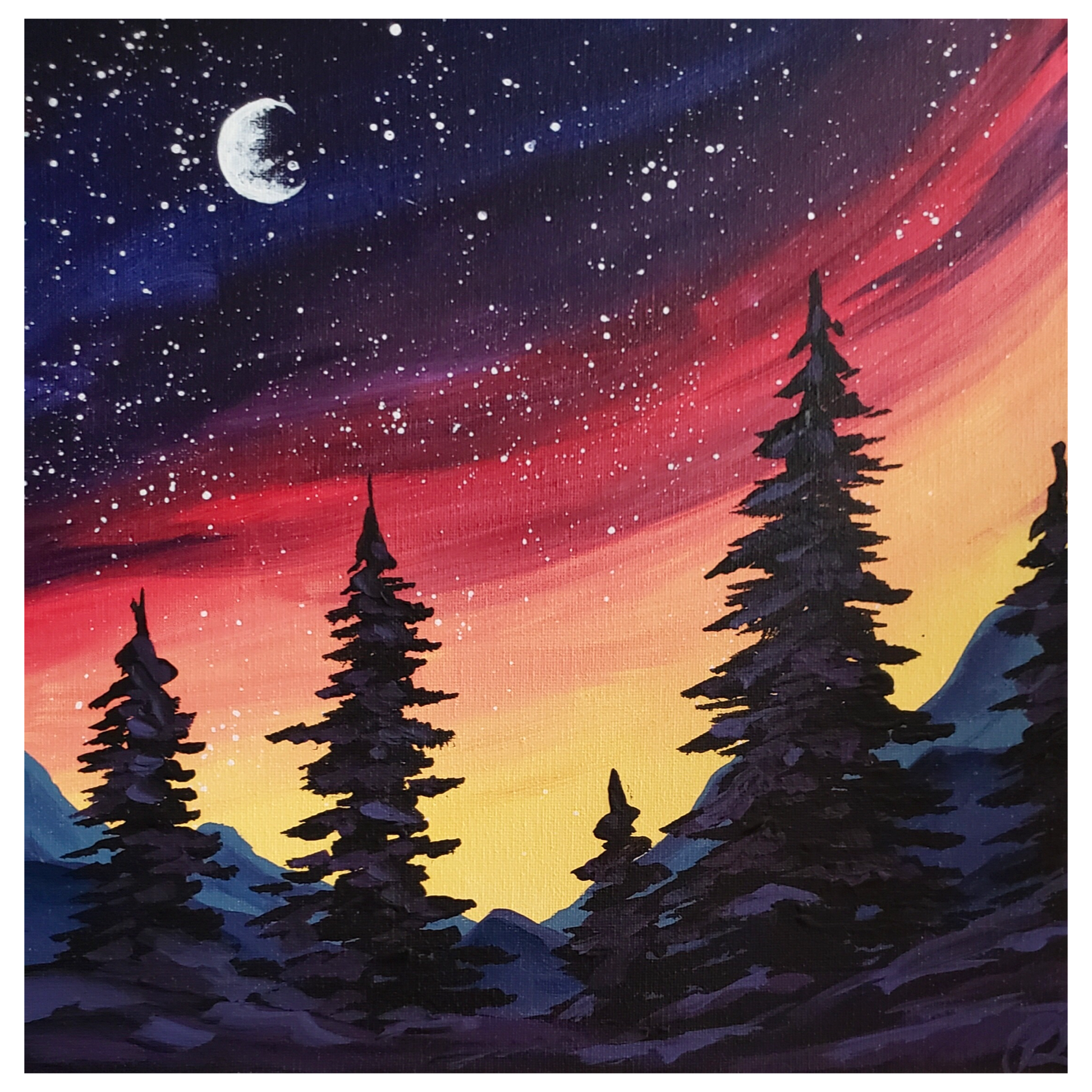 Escape into the forest and channel your inner Bob Ross with Mountain Sunset!