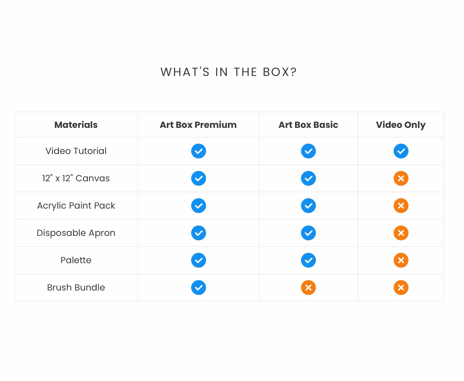 Art Boxes are painting kits that contain everything you need to make your own original piece of art! Our Art Box kits can be purchased with or without paint brushes just in case you have your own; just click the drop down menu to see all of our options. Every kit comes with a worksheet that has a link to a video tutorial filmed by one of our awesome instructors; you can even purchase just the video if you have all your supplies!